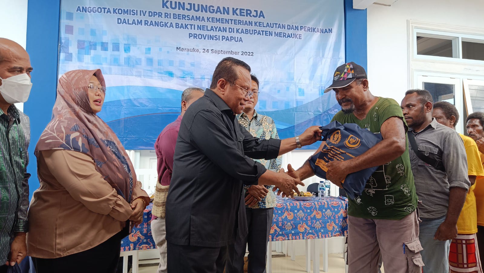 Metro Merauke – Anggota Komisi IV DPR RI, H. Sulaeman L Hamzah bersama Kementerian Kelautan dan Perikanan (KKP) kembali menyerahkan bantuan langsung, paket sembako untuk para nelayanan di Merauke, Sabtu (24/09/2022).