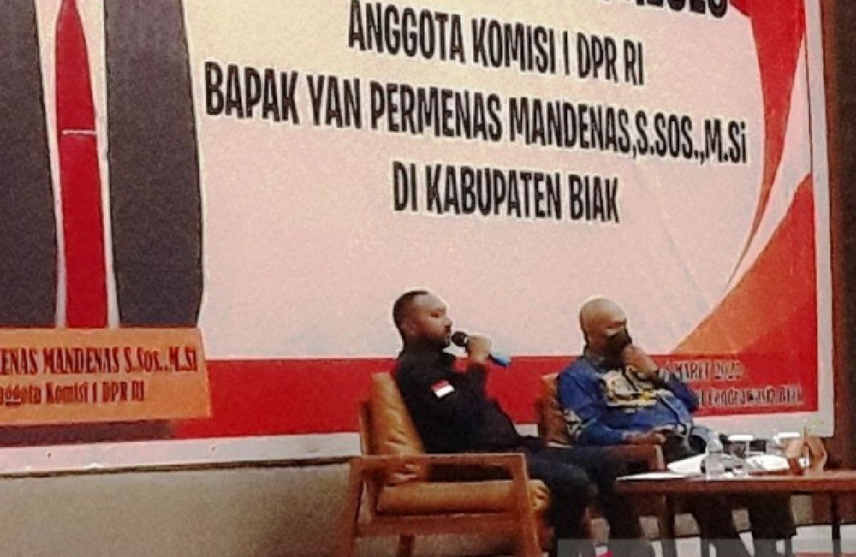 Dialog tatap muka anggota Komisi 1 DPR RI Yan Permenas Mandenas dengan Pemkab Biak Numfor didampingi Sekda Biak Markus Mansnembra dihadiri Danrem 173/PVB Brigjen Taufan Gestoro, perwakilan Koopsau III, Danguskamlatim, Forkompinda, tokoh adat,peremuan, pemuda dan tokoh agama. (Antara)