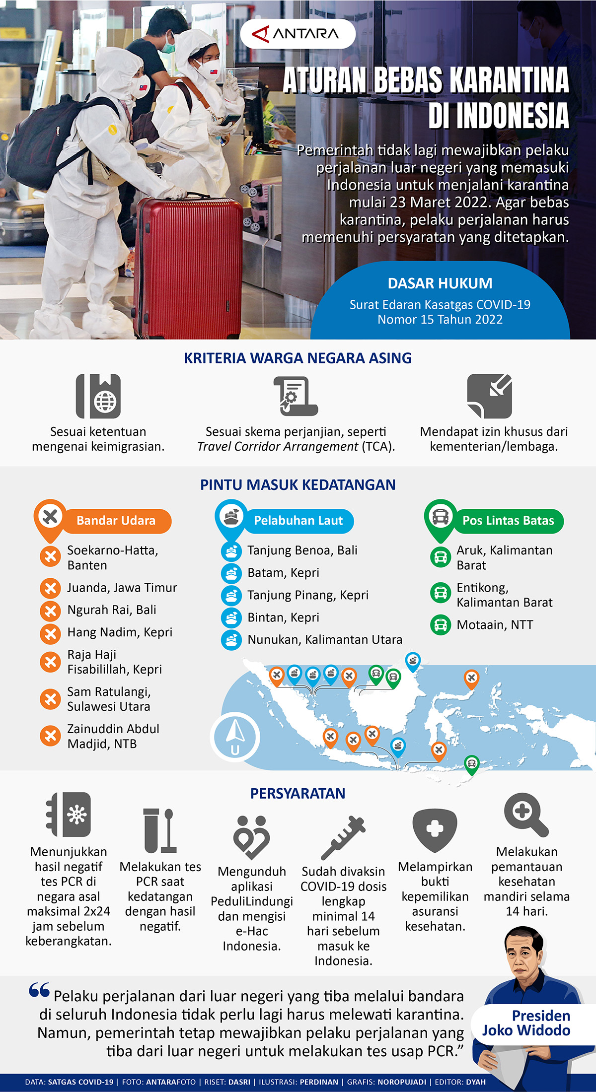 Metro Merauke – Pemerintah tidak lagi mewajibkan pelaku perjalanan luar negeri yang memasuki Indonesia untuk menjalani karantina mulai 23 Maret 2022. Agar bebas karantina, pelaku perjalanan harus memenuhi persyaratan yang ditetapkan. (Antara)