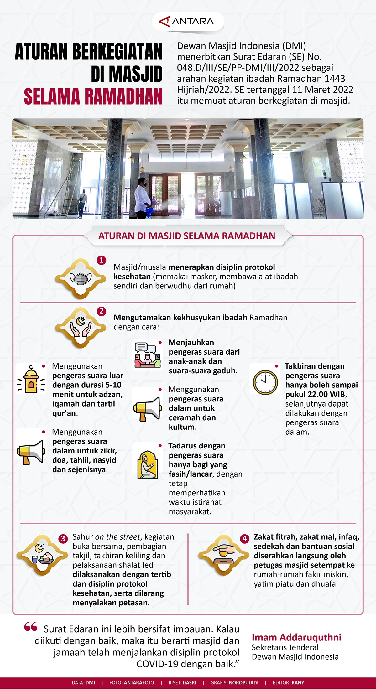 Metro Merauke – Dewan Masjid Indonesia (DMI) menerbitkan Surat Edaran (SE) No. 048.D/III/SE/PP-DMI/III/2022 sebagai arahan kegiatan ibadah Ramadan 1443 Hijriah/2022. SE tertanggal 11 Maret 2022 itu memuat aturan berkegiatan di masjid. (Antara)