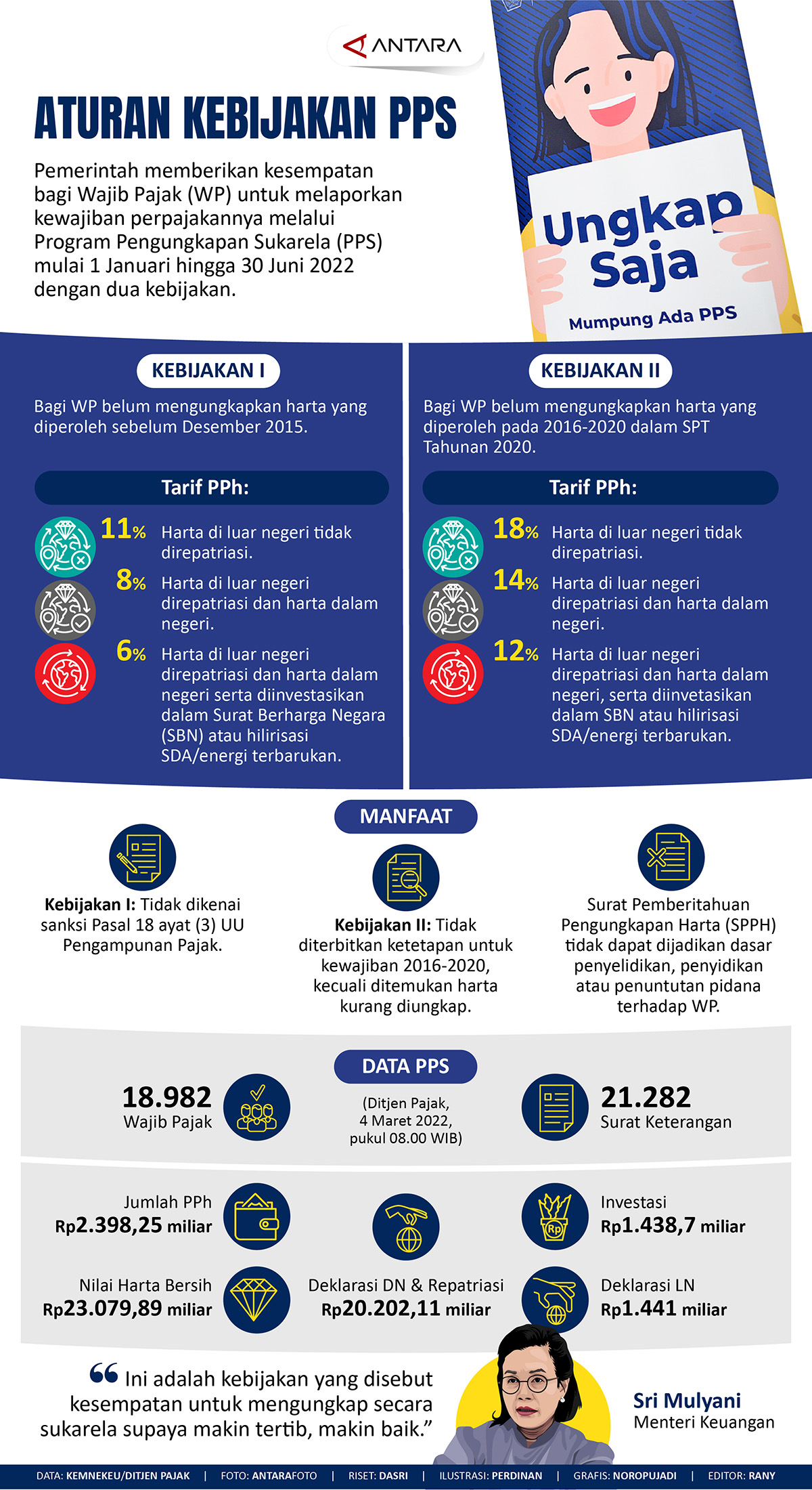 Metro Merauke – Pemerintah memberikan kesempatan bagi Wajib Pajak (WP) untuk melaporkan kewajiban perpajakannya melalui Program Pengungkapan Sukarela (PPS) mulai 1 Januari hingga 30 Juni 2022 dengan dua kebijakan (Antara)