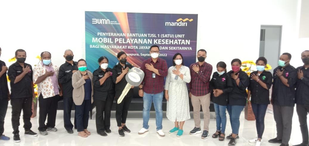 Penyerahan satu unit mobil pelayanan kesehatan dari Bank Mandiri diserahkan secara simbolik oleh Edi Surachman selaku Region Operations Head Region XII Papua kepada Ester Ruth, selaku Ketua Komunitas Medis Papua Tanpa Batas, disaksikan masyarakat Kampung Koya Tengah, Distrik Muaratami, Kota Jayapura, Kamis (06/10/2022).