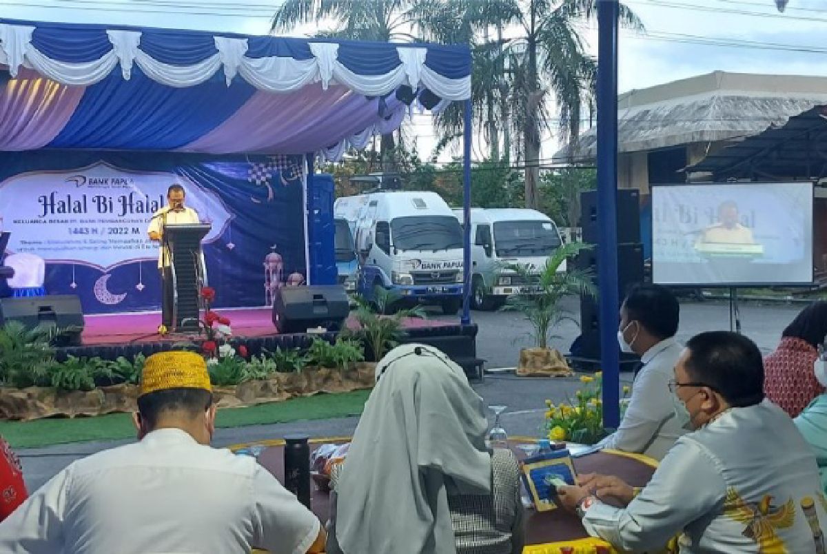 Sekadar diketahui Bank Pembangunan Daerah Papua mengelar acara Halal bi halal bersama keluarga besar, para pensiun dan nasabah, selain itu juga pemberian santunan yang diwakili oleh 15 santri dari pondok pesantren Darul Ilmi di halaman kantor Bank Papua (18/05/2022). (Antara)