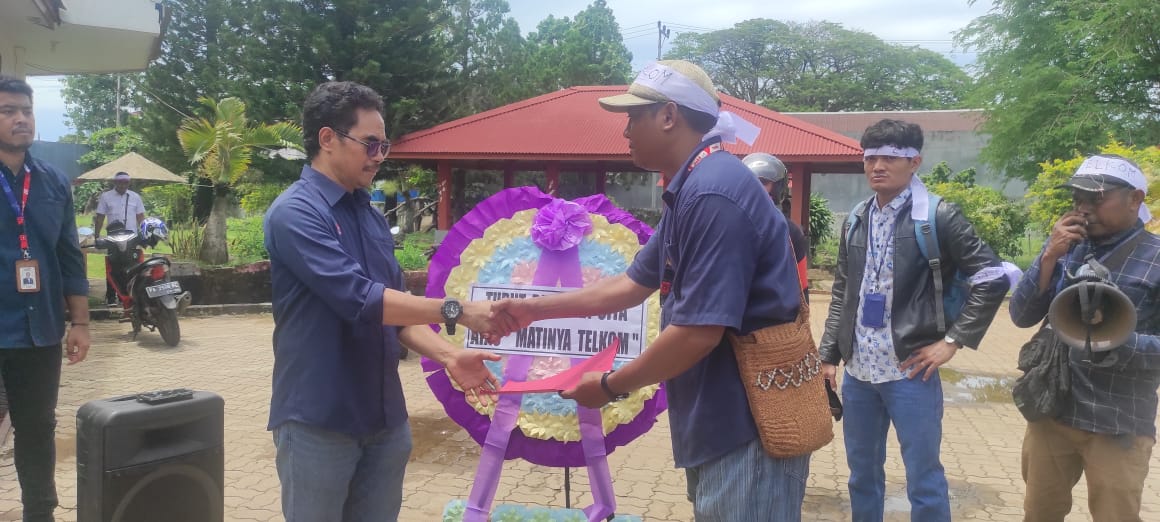 Puluhan wartawan yang dipimpin Ketua KWD, Emanuel Riberu mendatangi kantor Telkom sekira jam 10.00 WIT dengan membawa dua puluh buah karangan bunga yang melambangkan duka cita atas rusaknya jaringan internet sejak 4 Januari lalu.