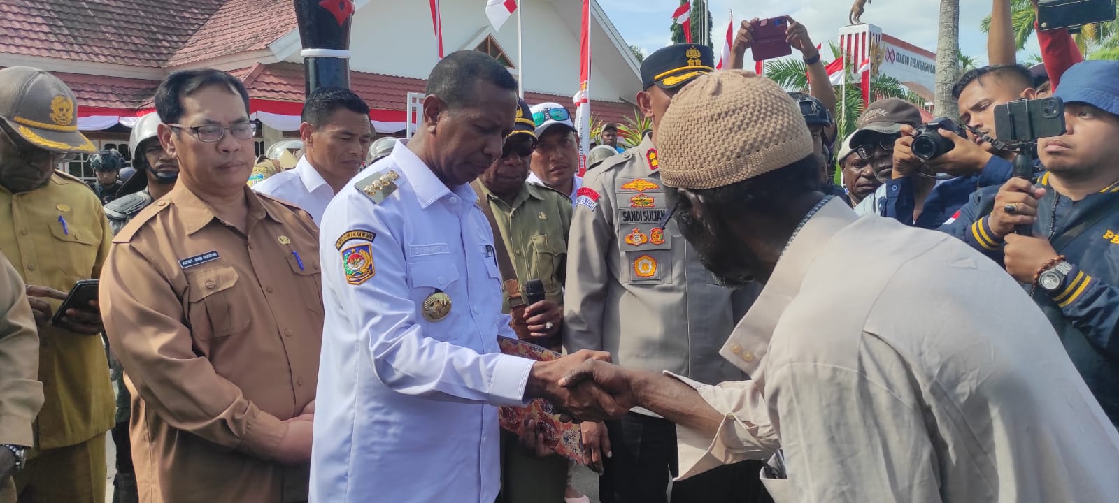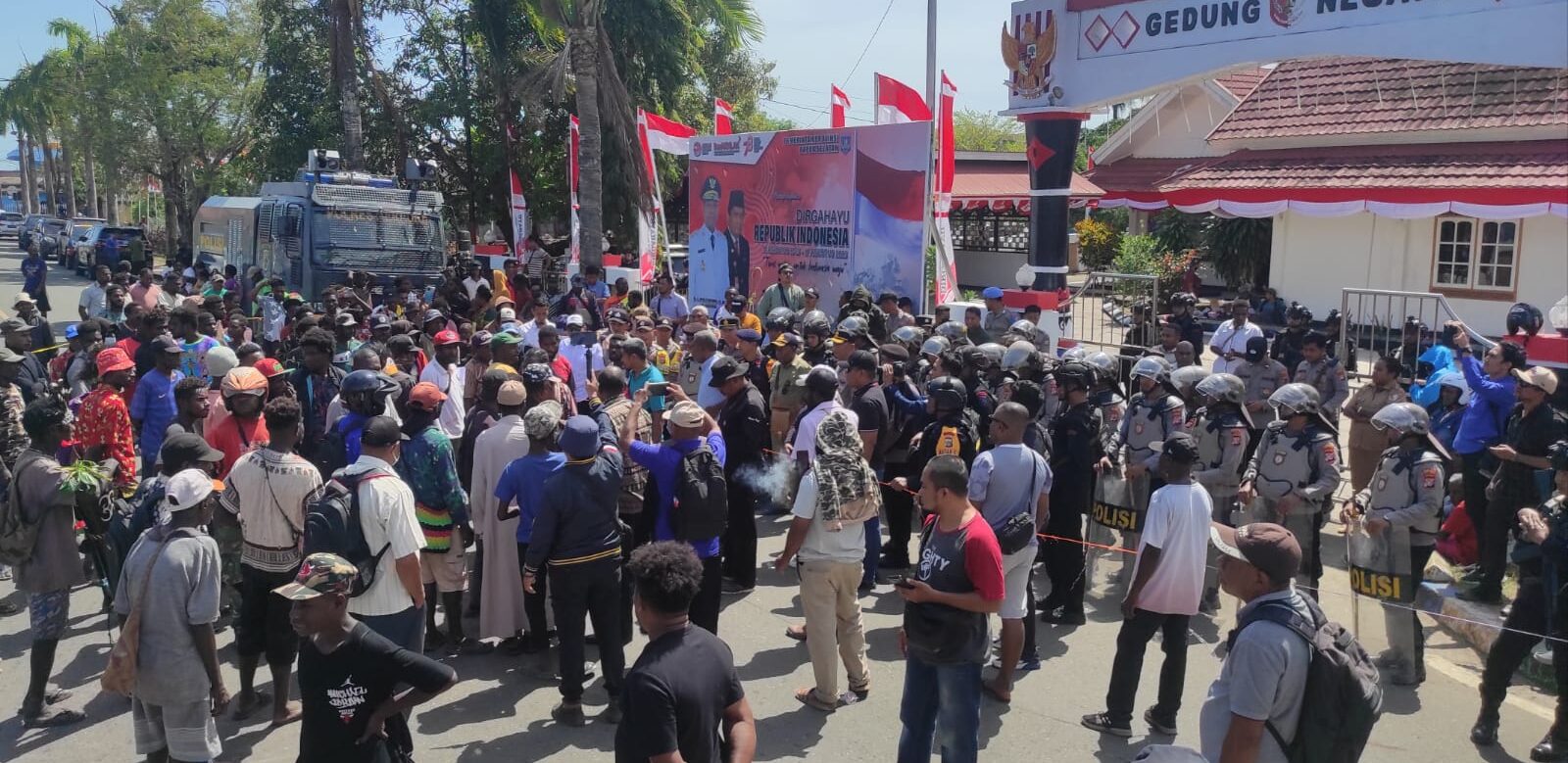 Setelah melakukan orasi selama dua jam, Pj Gubernur Papua Selatan, Apolo Safanpo, usai mengikuti gladi upacara HUT RI akhirnya menemui massa.