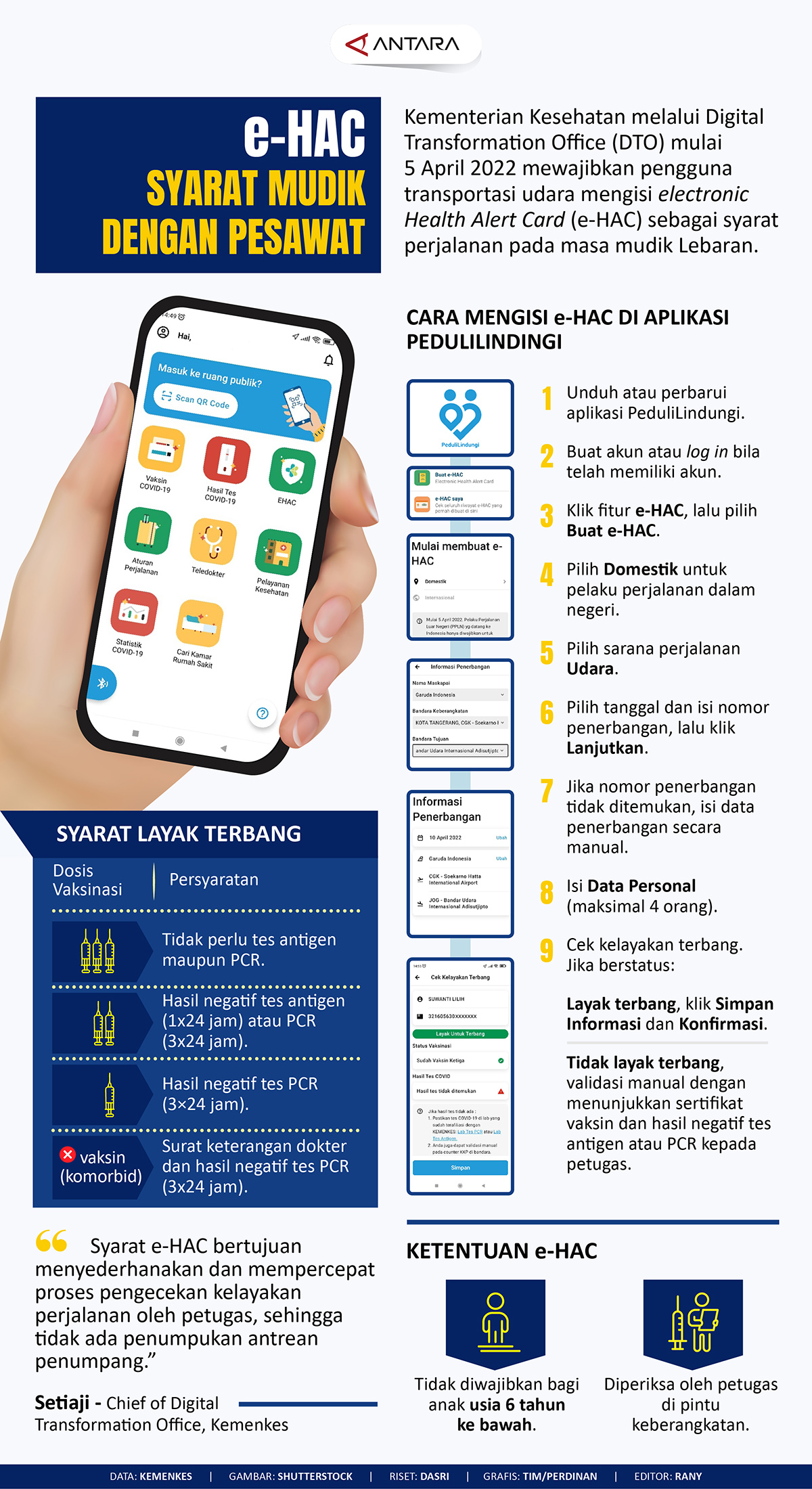 Metro Merauke – Kementerian Kesehatan melalui Digital Transformation Office (DTO) mulai 5 April 2022 mewajibkan pengguna transportasi udara mengisi electronic Health Alert Card (e-HAC) sebagai syarat perjalanan pada masa mudik Lebaran. (Antara)