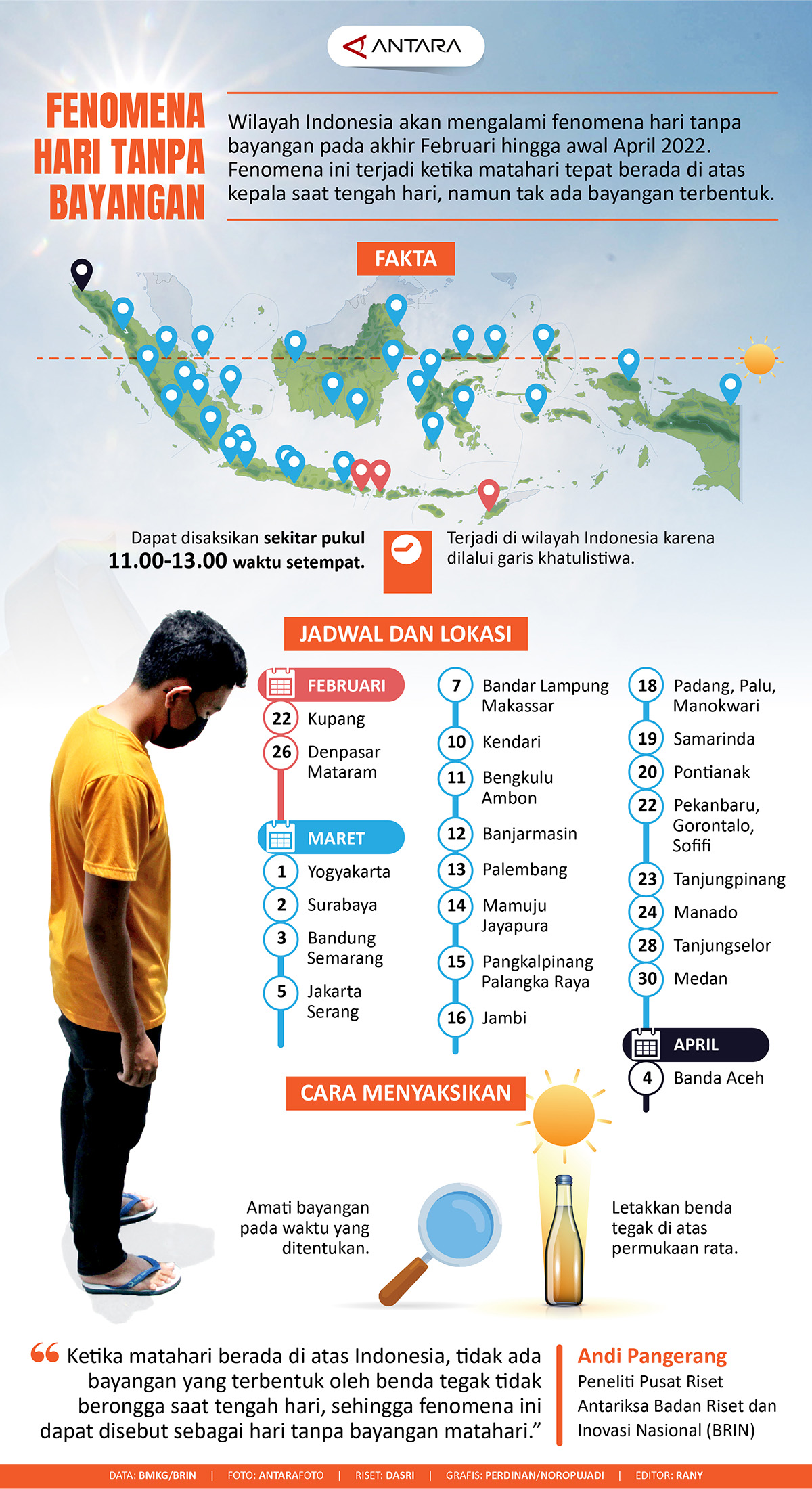 Metro Merauke – Wilayah Indonesia akan mengalami fenomena hari tanpa bayangan pada akhir Februari hingga awal April 2022. Fenomena ini terjadi ketika matahari tepat berada di atas kepala saat tengah hari, namun tak ada bayangan terbentuk. (Antara)