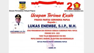 Metro Merauke – Fraksi Gerakan Indonesia Raya (Gerindra) Dewan Perwakilan Rakyat (DPR) Papua, mengucapkan terimakasih atas kepemimpinan Lukas Enembe sebagai Gubernur Provinsi Papua selama dua periode (2013-2018 dan 2018-2023).