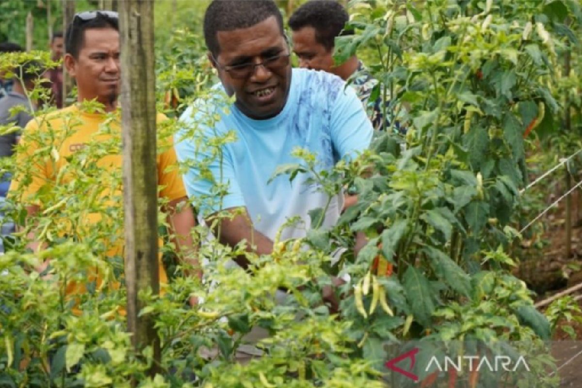 Setelah menyerahkan bantuan sarana produksi pertanian, Bupati didampingi Ketua TP PKK Biak Numfor Ny. Ruth Naomi Naap Rumkabu meninjau sejumlah tanaman pertanian masyarakat dan melakukan langsung panen sayur-sayuran di kampung Suneri. (Antara)