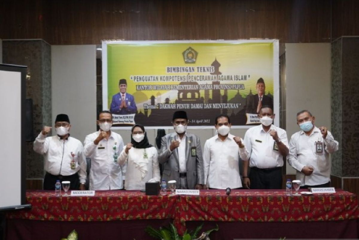Kanwil Kemenag Provinsi Papua menggelar bimbingan teknis penguatan kompetensi penceramah agama Islam dengan tema “Dakwah dengan penuh damai dan menyejukkan” sejak pada Selasa (12/4) hingga Kamis (14/4) bertempat di salah satu hotel berbintang Kota Jayapura. (Antara)