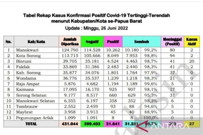 Juru bicara satgas COVID-19 Papua Barat dr Arnold Tiniap, mengatakan bahwa dari 27 kasus positif Papua Barat, 20 kasus berasal dari Teluk Bintuni, Manokwari 2 kasus, Kota Sorong 2 kasus, Fakfak 2 kasus, dan Kaimana 1 kasus.
