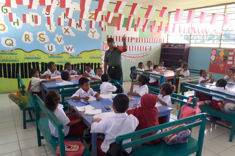 Metro Merauke – Koramil 1708-05/Numfor membantu proses pembelajaran kepada siswa SD Negeri 1 Kornasoren serta memberikan pengamanan, sehingga anak-anak dapat belajar dengan tenang dan tertib tanpa adanya gangguan, di Kampung Kornasoren, Distrik Numfor Timur, Kabupaten Baik Numfor, Papua.