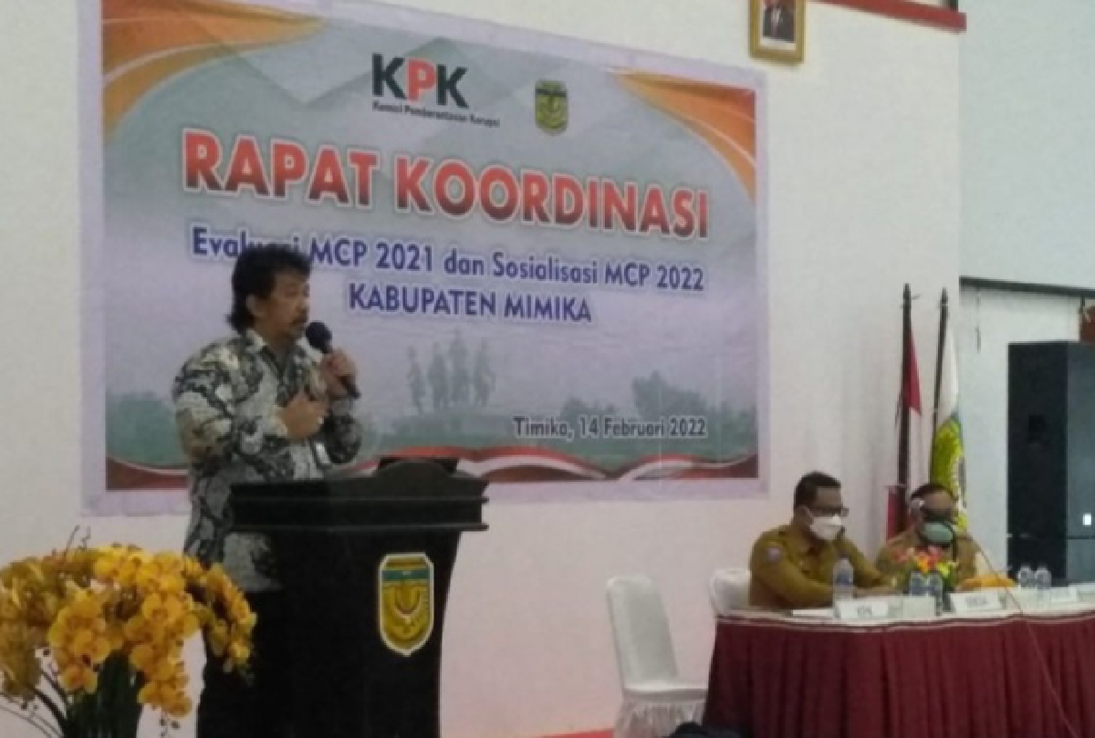 Metro Merauke – Komisi Pemberantasan Korupsi (KPK) menyoroti capaian Pusat Pemantauan Pencegahan/Monitoring Center for Prevention (MCP) Kabupaten Mimika 2021 hanya mencapai 36,62 persen atau menempati peringkat sembilan di Provinsi Papua, padahal Mimika merupakan daerah dengan postur APBD terbesar di Papua dan terbesar kedua di Indonesia.