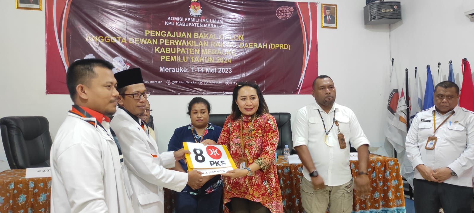 Penyerahan berkas pendaftaran bakal calon legislatif dari DPD PKS Merauke diterima langsung Ketua KPU Merauke, Theresia Mahuse bersama anggota komisioner.
