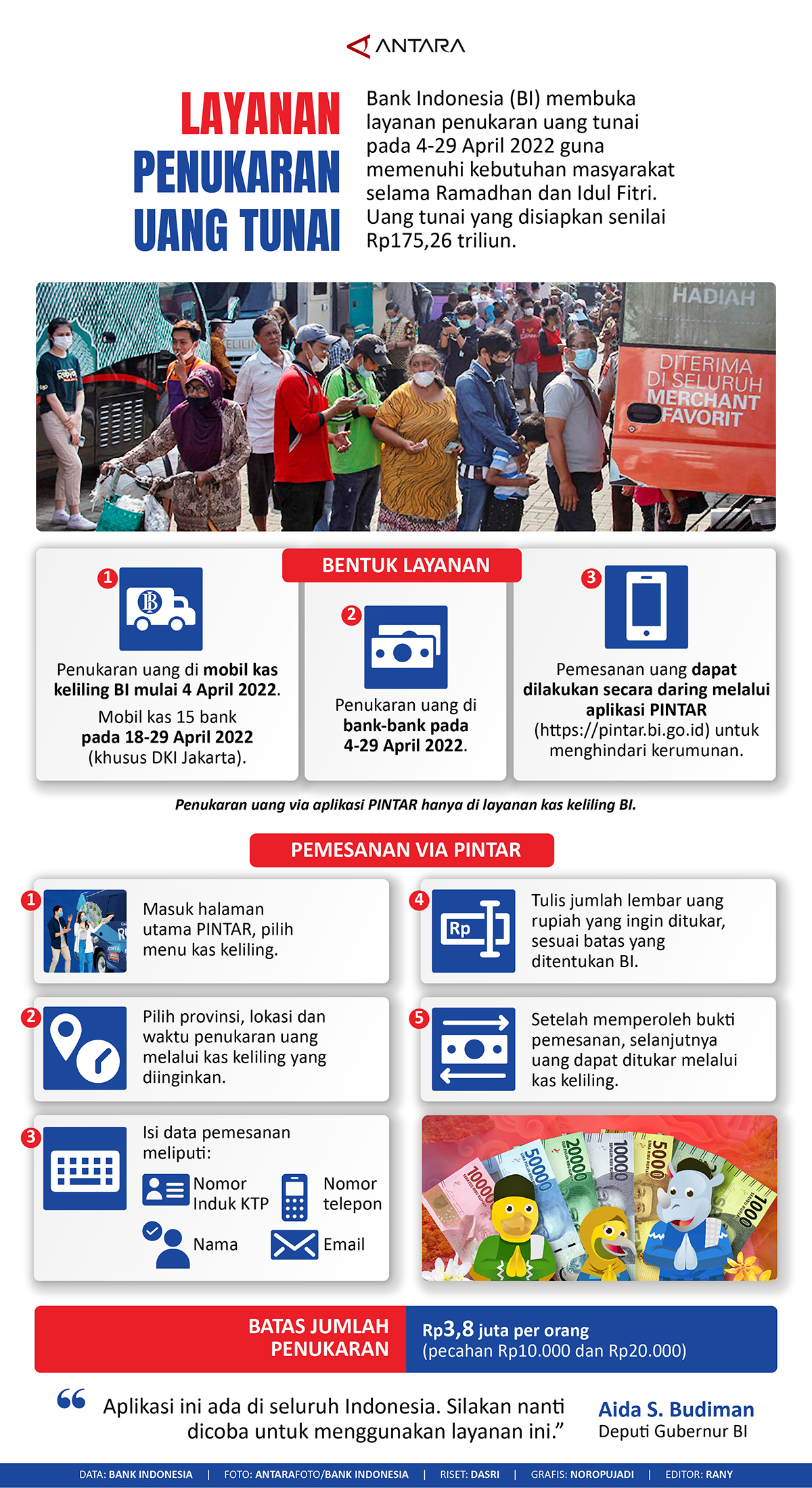Metro Merauke – Bank Indonesia (BI) membuka layanan penukaran uang tunai pada 4-29 April 2022 guna memenuhi kebutuhan masyarakat selama Ramadhan dan Idul Fitri. Uang tunai yang disiapkan senilai Rp175,26 triliun. (Antara)