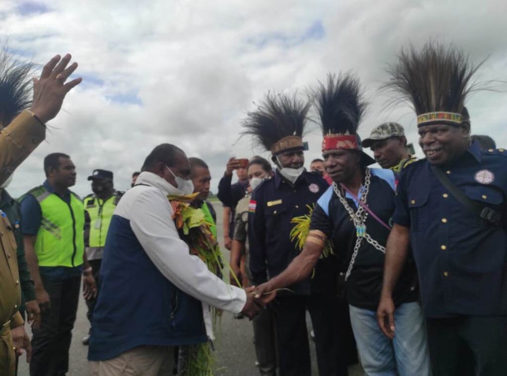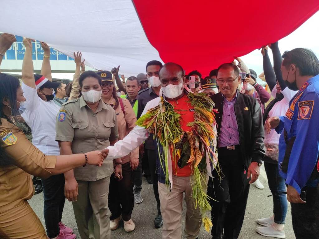 Euforia masyarakat terlihat dari Bandara Mopah Merauke, saat menyambut kedatangan Bupati Romanus Mbaraka disusul pengalungan bunga oleh Wakil Bupati H. Riduwan.