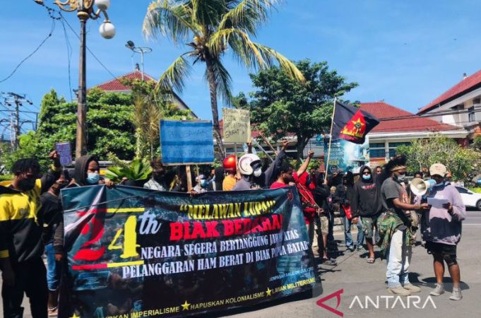 Metro Merauke – Puluhan aparat dari Polresta Denpasar mengamankan demonstrasi mahasiswa asal Papua yang tergabung dalam Aliansi Mahasiswa Papua (AMP) dan Front Rakyat Indonesia untuk West Papua (FRIWP) yang meminta pemerintah menyelesaikan kasus pelanggaran HAM di Biak, Papua Barat.