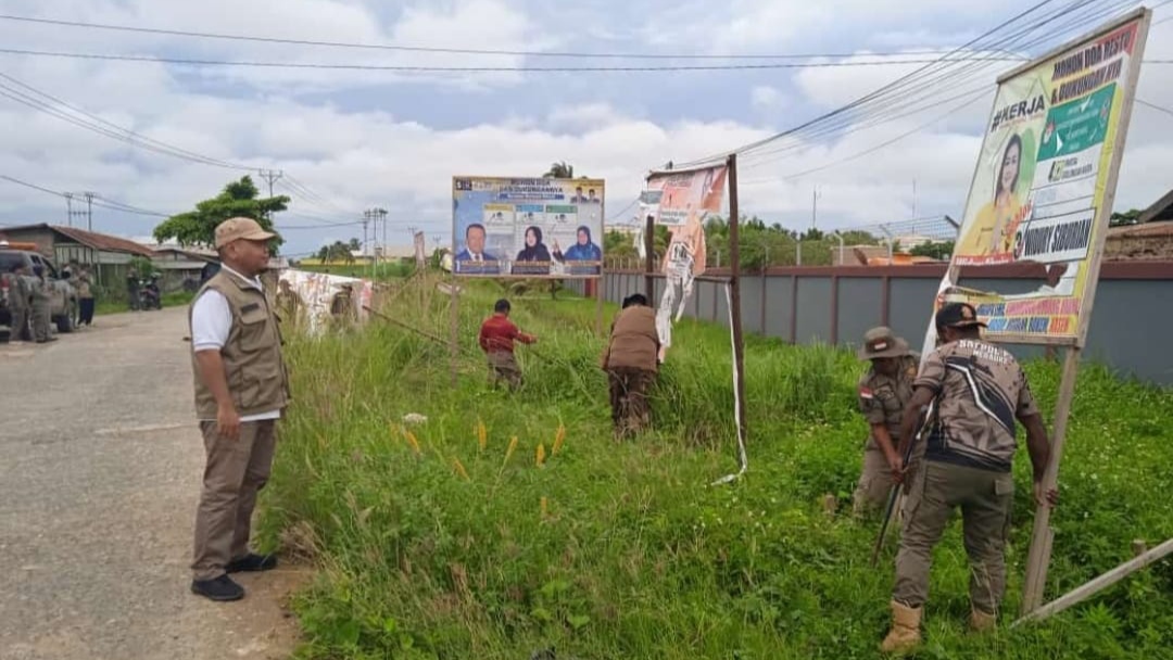 Metro Merauke – Alat Peraga Kampanye (APK) caleg, DPD RI maupun Capres-Cawapres yang masih terpasang diturunkan petugas, Minggu (11/02/2024).