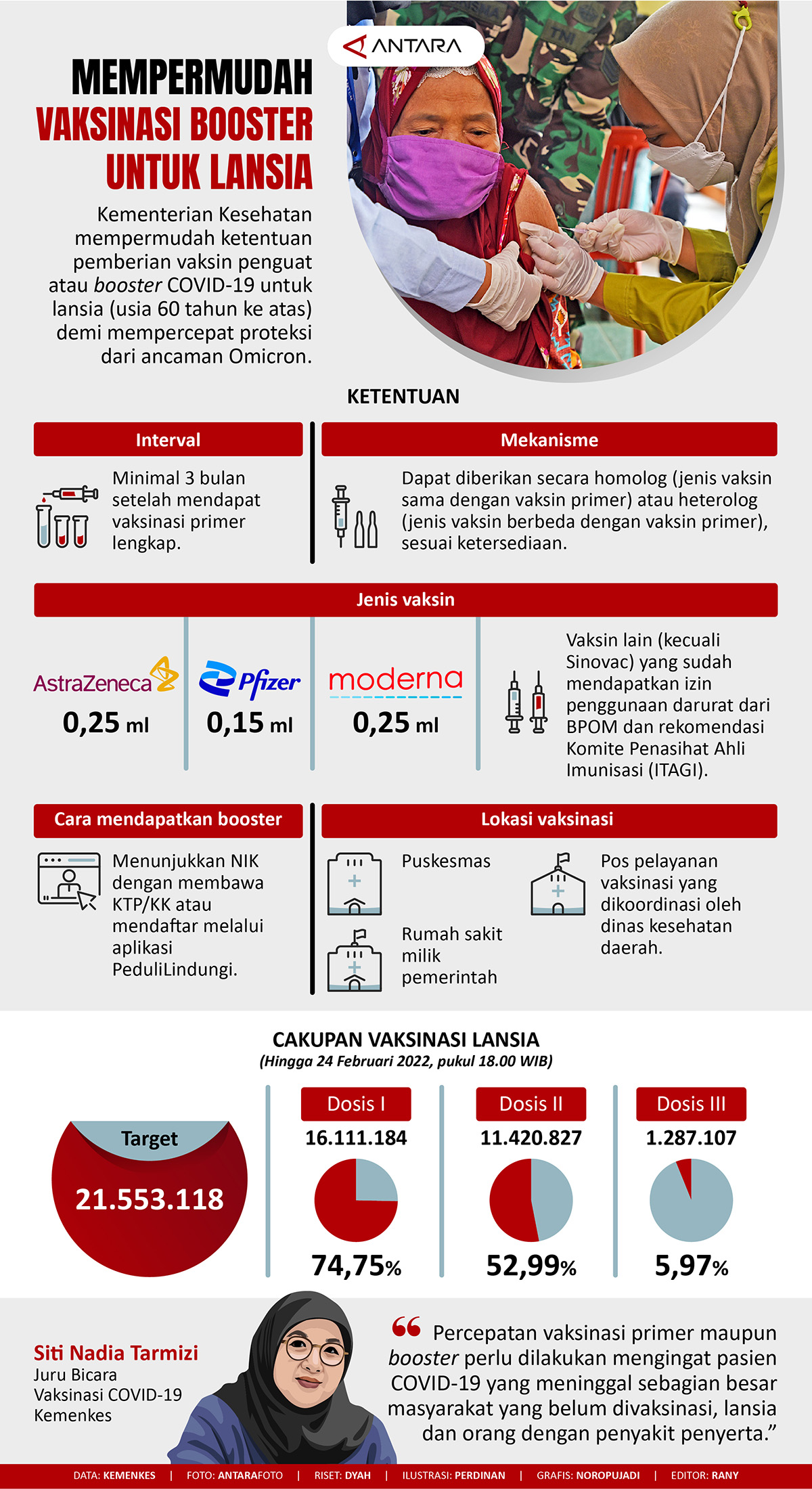 Mempermudah Vaksinasi Booster untuk Lansia Redaksi Metro27 Februari 202227 Februari 2022 Metro Merauke – Kementerian Kesehatan mempermudah ketentuan pemberian vaksin penguat atau booster COVID-19 untuk lansia (usia 60 tahun ke atas) demi mempercepat proteksi dari ancaman Omicron. (Antara) Pos terkaitSelamat Hari Kebangkitan Nasional 20 Mei 2023Selamat Memperingati Hari BuruhSelamat Hari Raya Idul Fitri 2023/1444 HSelamat Hari Raya Idul Fitri Mohon Maaf Lahir dan Batin 2023/1444 HSelamat Merayakan Hari Raya Paskah 2023Selamat Merayakan Hari Raya Paskah 2023SELAMAT HARI RAYA NYEPI 2023 TAHUN BARU SAKAIsra Mikraj Nabi Muhammad SAWHari Pers Nasional 2023Hari gizi dan makanan 2023SELAMAT TAHUN BARU IMLEK 2023Hari Guru Nasional dan HUT PGRI ke-77Selamat dan Sukses atas Pelantikan Dr. Ir. Apolo Safanpo, S.T., M.T Sebagai Penjabat Gubernur Papua SelatanSelamat Atas Pelantikan Pj. Gubernur Papua SelatanHari Pahlawan 10 November 2022Hari Sumpah Pemuda 2022Sidang Sinode Ke X & Mupel Ke V ( GPI ) di Papua 2022HUT Ikatan Dokter Indonesia ( IDI ) 2022HUT GKI Di Tanah Papua 2022Hari Santri Nasional 2022Dirgahayu TNI yang ke-77 TahunHari Kelautan Nasional 2022Hari Anak Nasional 2022Hari Pramuka 2022Hari Raya Idul Adha 1443H/2022Dirgahayu Indonesia ke-77 2022Hari Veteran Nasional 2022Tahun Baru Islam 2022Hari Radio Republik Indonesia 2022Hari Bakti Pos & Telekomoniksi 2022