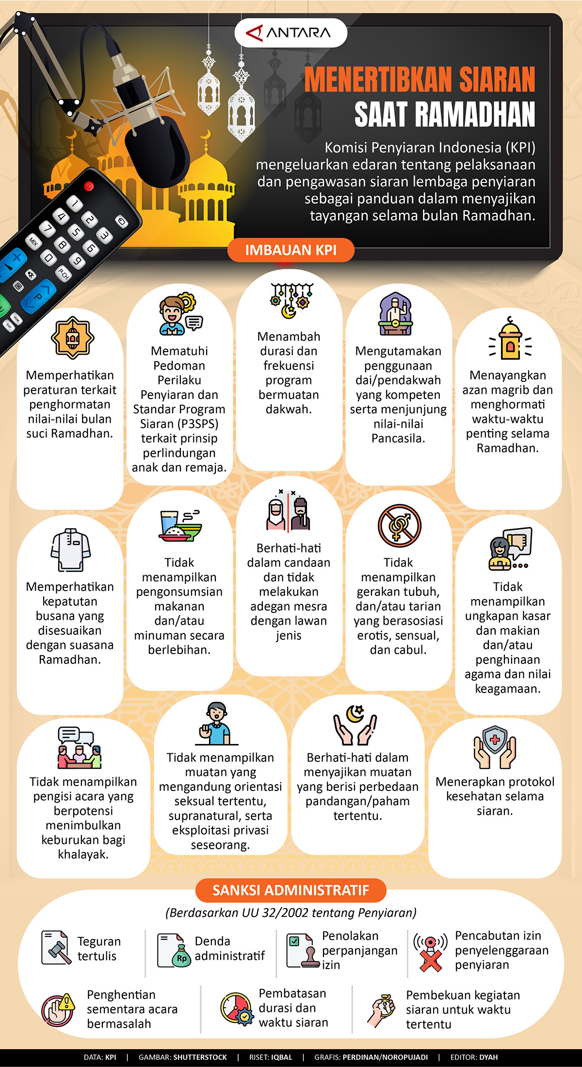 Menertibkan Siaran Saat Ramadhan Redaksi Metro26 Maret 202225 Maret 2022 Metro Merauke – Komisi Penyiaran Indonesia (KPI) mengeluarkan edaran tentang pelaksanaan dan pengawasan siaran lembaga penyiaran sebagai panduan dalam menyajikan tayangan selama bulan Ramadhan. (Antara) Pos terkaitSelamat Hari Kebangkitan Nasional 20 Mei 2023Selamat Memperingati Hari BuruhSelamat Hari Raya Idul Fitri 2023/1444 HSelamat Hari Raya Idul Fitri Mohon Maaf Lahir dan Batin 2023/1444 HSelamat Merayakan Hari Raya Paskah 2023Selamat Merayakan Hari Raya Paskah 2023SELAMAT HARI RAYA NYEPI 2023 TAHUN BARU SAKAIsra Mikraj Nabi Muhammad SAWHari Pers Nasional 2023Hari gizi dan makanan 2023SELAMAT TAHUN BARU IMLEK 2023Hari Guru Nasional dan HUT PGRI ke-77Selamat dan Sukses atas Pelantikan Dr. Ir. Apolo Safanpo, S.T., M.T Sebagai Penjabat Gubernur Papua SelatanSelamat Atas Pelantikan Pj. Gubernur Papua SelatanHari Pahlawan 10 November 2022Hari Sumpah Pemuda 2022Sidang Sinode Ke X & Mupel Ke V ( GPI ) di Papua 2022HUT Ikatan Dokter Indonesia ( IDI ) 2022HUT GKI Di Tanah Papua 2022Hari Santri Nasional 2022Dirgahayu TNI yang ke-77 TahunHari Kelautan Nasional 2022Hari Anak Nasional 2022Hari Pramuka 2022Hari Raya Idul Adha 1443H/2022Dirgahayu Indonesia ke-77 2022Hari Veteran Nasional 2022Tahun Baru Islam 2022Hari Radio Republik Indonesia 2022Hari Bakti Pos & Telekomoniksi 2022