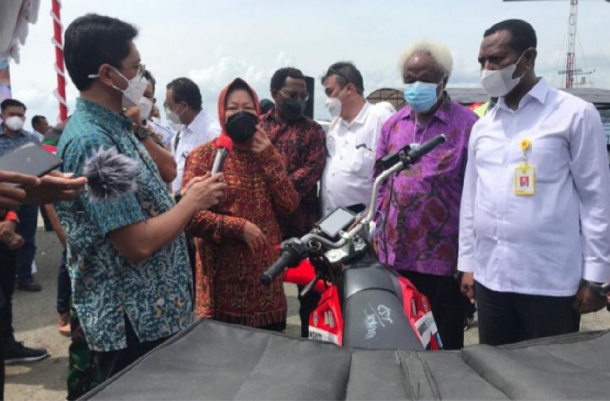 Metro Merauke – Menteri Sosial Tri Rismaharini meluncurkan kapal “fiberglass” dan motor listrik hasil kerja sama Institut Teknologi Sepuluh Nopember (ITS) dan Universitas Cendrawasih (Uncen) di Distrik Navigasi, Kota Jayapura, Rabu (23/03/2022).