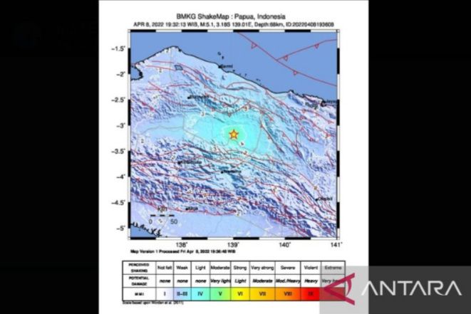 Metro Merauke – Gempa dengan magnitudo (M) 5,1 mengguncang Provinsi Papua pada Jumat malam sekitar pukul 19.32 WIB, menurut informasi Badan Meteorologi, Klimatologi dan Geofisika (BMKG) yang diterima di Jakarta.