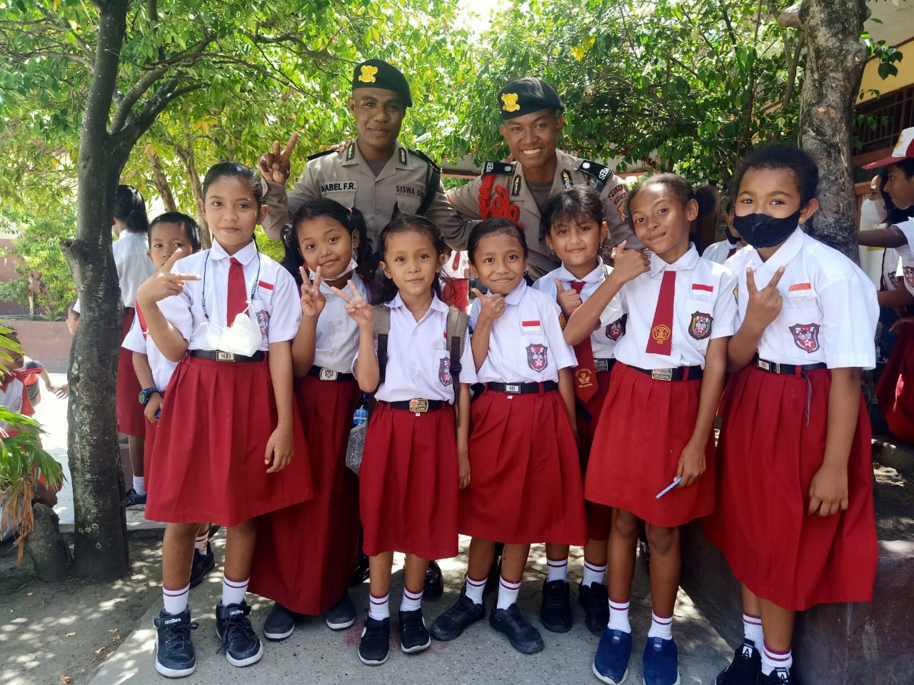 Metro Merauke – Pelajar di SD Negeri 1 Abepura di Jalan Gerilyawan, Kelurahan Awiyo, Distrik Abepura, Kota Jayapura bangga dikunjungi oleh tujuh perwakilan siswa Diktukba Polri Gel II 2022 dari SPN Polda Papua, Selasa pagi 22 November 2022