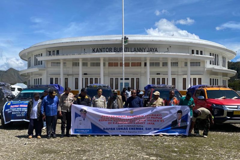 Bantuan secara simbolis diserahkan oleh Sekda Papua Muhammad Ridwan Rumasukun kepada Penjabat Bupati Lanny Jaya Petrus Wakerkwa, dan turut disaksikan Asisten Sekda Papua Bidang Pemerintahan Doren Wakerkwa serta Kepala Bappeda Papua Johanis Walilo di halaman Kantor Bupati setempat, Sabtu. (Antara)