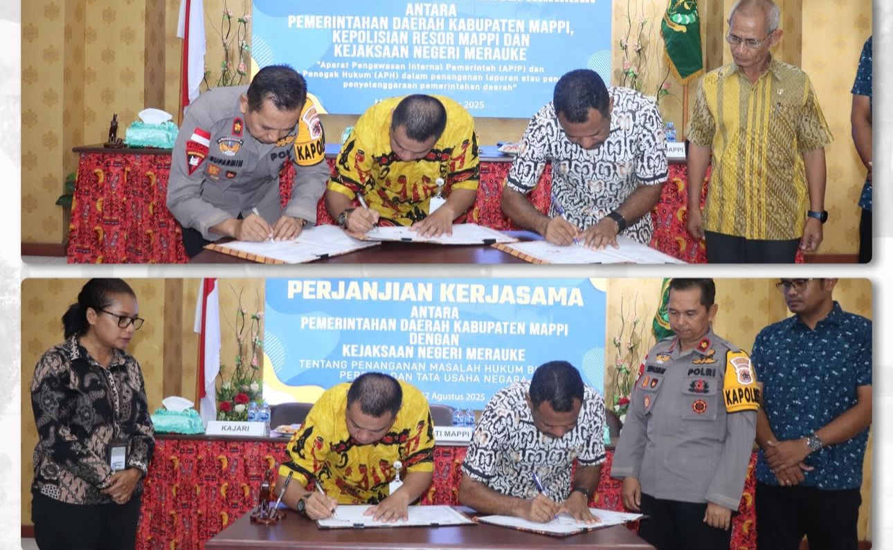 Ditambahkan, esensi dari Perjanjian Kerjasama antara Kejaksaan Negeri Merauke, Pemerintah Kabupaten Mappi dan Kepolisian Resor Mappi, memberikan pedoman yang mengatur secara rinci dan terarah berkenaan dengan koordinasi Aparat Pengawasan Internal Pemerintah (APIP) dan Aparat Penegak Hukum (APH).