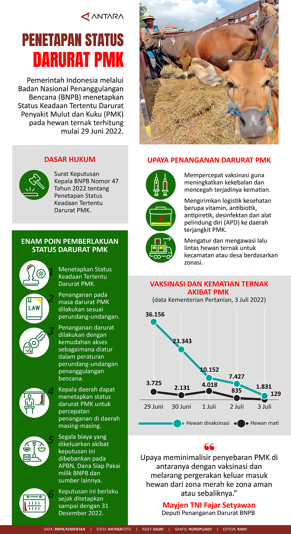 Penetapan Status Darurat PMK Redaksi Metro9 Juli 20228 Juli 2022 Metro Merauke – Pemerintah Indonesia melalui Badan Nasional Penanggulangan Bencana (BNPB) menetapkan Status Keadaan Tertentu Darurat Penyakit Mulut dan Kuku (PMK) pada hewan ternak terhitung mulai 29 Juni 2022. (Antara) Pos terkaitSelamat Hari Kebangkitan Nasional 20 Mei 2023Selamat Memperingati Hari BuruhSelamat Hari Raya Idul Fitri 2023/1444 HSelamat Hari Raya Idul Fitri Mohon Maaf Lahir dan Batin 2023/1444 HSelamat Merayakan Hari Raya Paskah 2023Selamat Merayakan Hari Raya Paskah 2023SELAMAT HARI RAYA NYEPI 2023 TAHUN BARU SAKAIsra Mikraj Nabi Muhammad SAWHari Pers Nasional 2023Hari gizi dan makanan 2023SELAMAT TAHUN BARU IMLEK 2023Hari Guru Nasional dan HUT PGRI ke-77Selamat dan Sukses atas Pelantikan Dr. Ir. Apolo Safanpo, S.T., M.T Sebagai Penjabat Gubernur Papua SelatanSelamat Atas Pelantikan Pj. Gubernur Papua SelatanHari Pahlawan 10 November 2022Hari Sumpah Pemuda 2022Sidang Sinode Ke X & Mupel Ke V ( GPI ) di Papua 2022HUT Ikatan Dokter Indonesia ( IDI ) 2022HUT GKI Di Tanah Papua 2022Hari Santri Nasional 2022Dirgahayu TNI yang ke-77 TahunHari Kelautan Nasional 2022Hari Anak Nasional 2022Hari Pramuka 2022Hari Raya Idul Adha 1443H/2022Dirgahayu Indonesia ke-77 2022Hari Veteran Nasional 2022Tahun Baru Islam 2022Hari Radio Republik Indonesia 2022Hari Bakti Pos & Telekomoniksi 2022