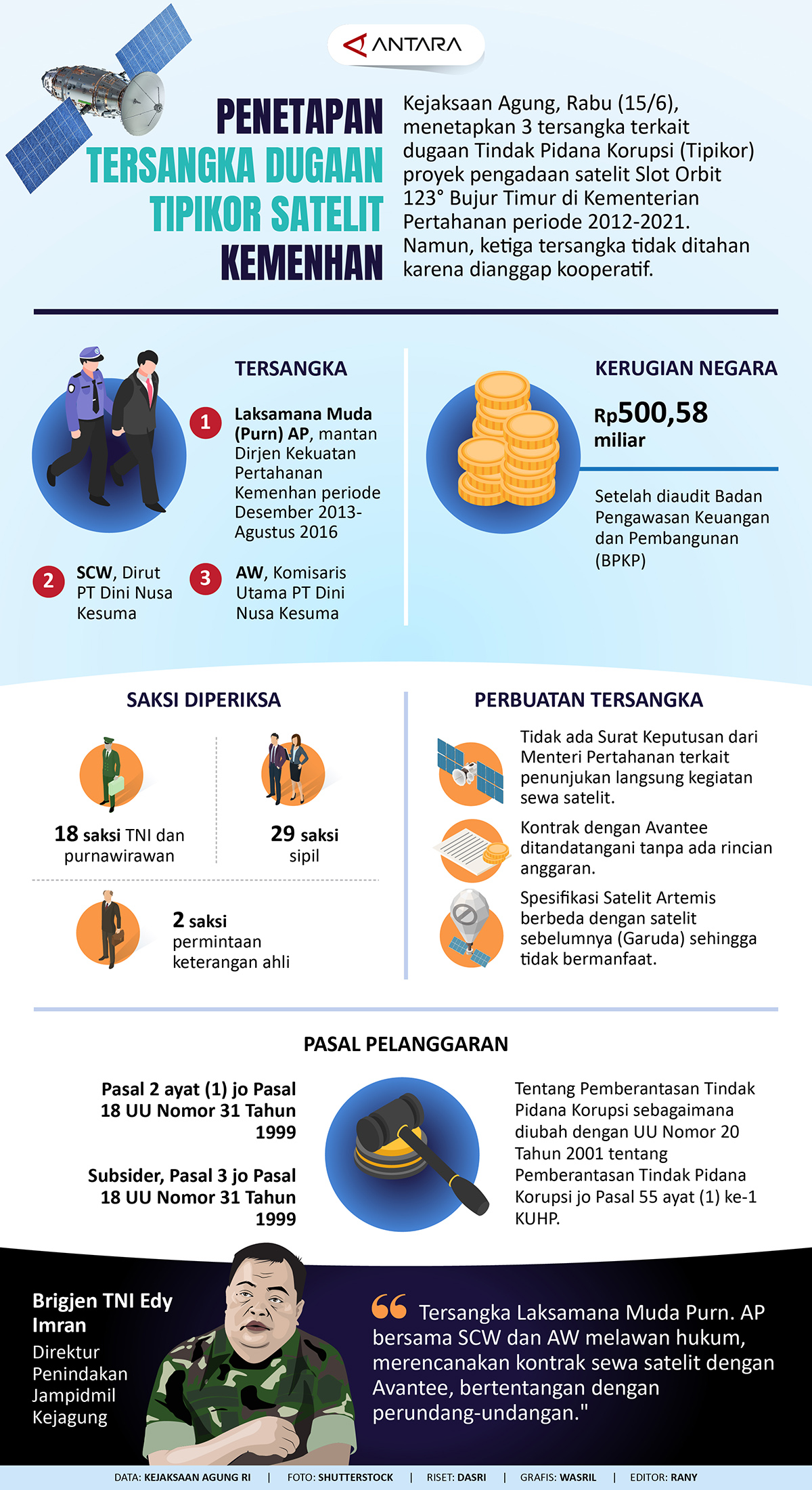 Metro Merauke – Kejaksaan Agung, Rabu (15/06/2022), menetapkan 3 tersangka terkait dugaan Tindak Pidana Korupsi (Tipikor) proyek pengadaan satelit Slot Orbit 123° Bujur Timur di Kementerian Pertahanan periode 2012-2021. Namun, ketiga tersangka tidak ditahan karena dianggap kooperatif. (Antara)
