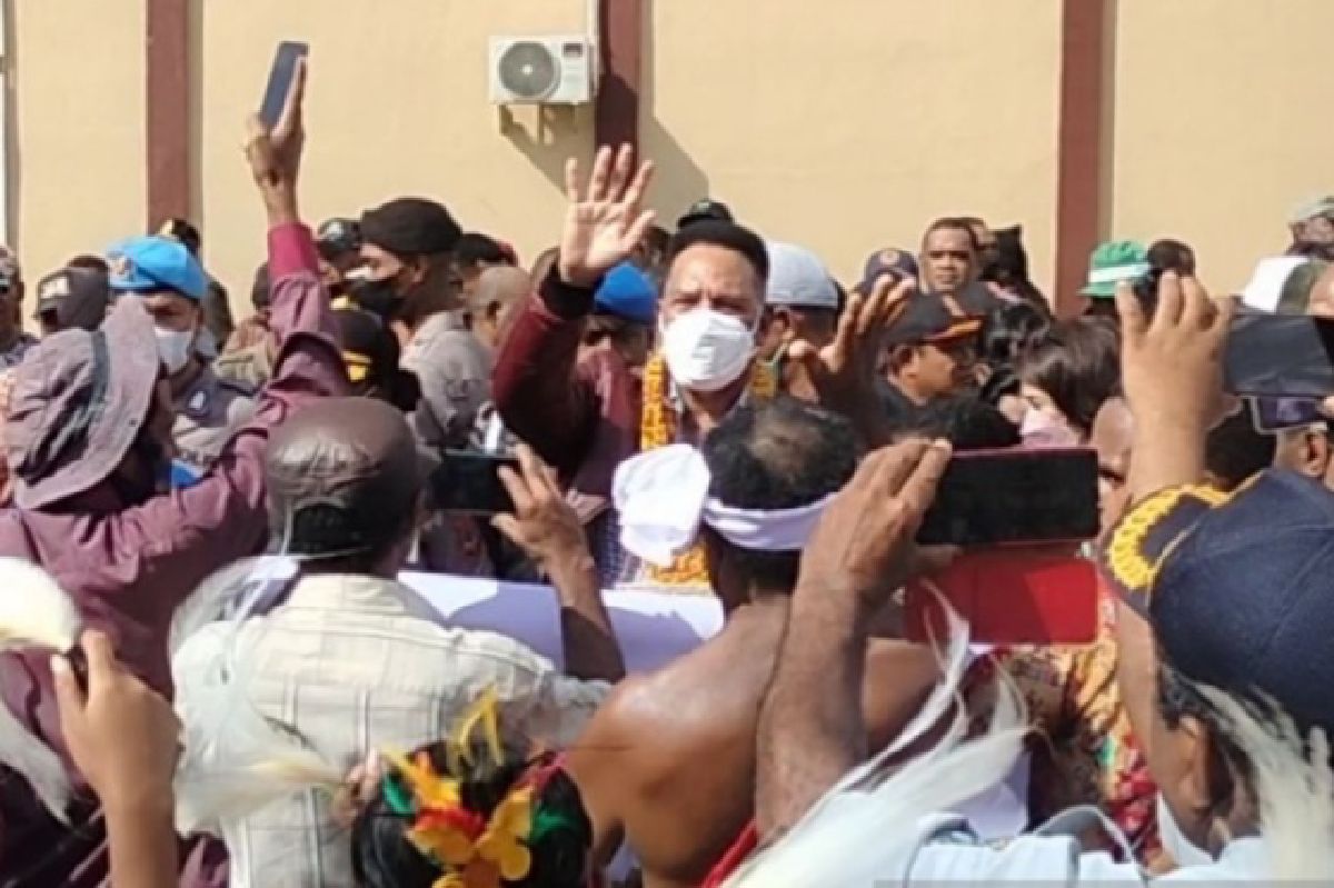 Tarian khas masyarakat adat Doberay dan Bomberay menyambut kedatangan Paulus Waterpauw di Ibu Kota Provinsi Papua Barat.