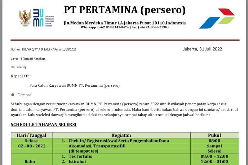 Dirinya juga mendapatkan informasi yang disebarkan pihak-pihak tidak bertanggung jawab terkait penerimaan karyawan Pertamina, tetapi ujung-ujungnya meminta calon karyawan untuk mengirimkan uang dengan berbagai modus.
