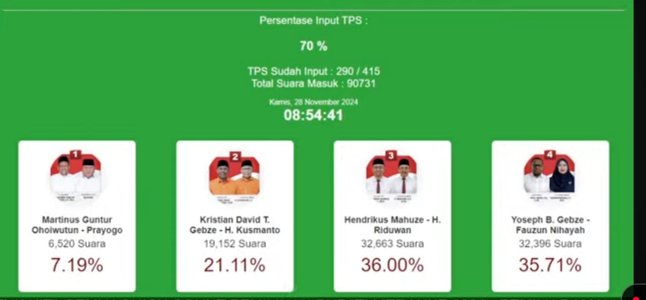 Dari update perolehan suara sementara sekira pukul 10.00 WIT, Kamis (28/11/2024), suara yang terkumpul mencapai 70 persen itu, pasangan Hendrikus Mahuse – Riduwan (MARI) sementara unggul atas Paslon Yosep Bladib Gebze dan Fauzun Nihayah (Yosfan).
