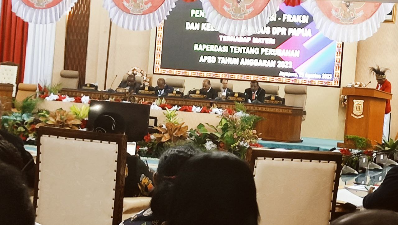 Desakan itu disampaikan Poksus DPR Papua, Fraksi PDIP, Fraksi PAN, Fraksi Golkar, Fraksi Gabungan I dan Fraksi Gabungan II dalam paripurna ke VI dengan agenda pendapat akhir fraksi-fraksi dan Kelompok Khusus DPR Papua terhadap materi Raperdasi tentang perubahan APBD Tahun Anggaran 2023, di ruang siang DPR Papua, Jumat (25/8/2023).