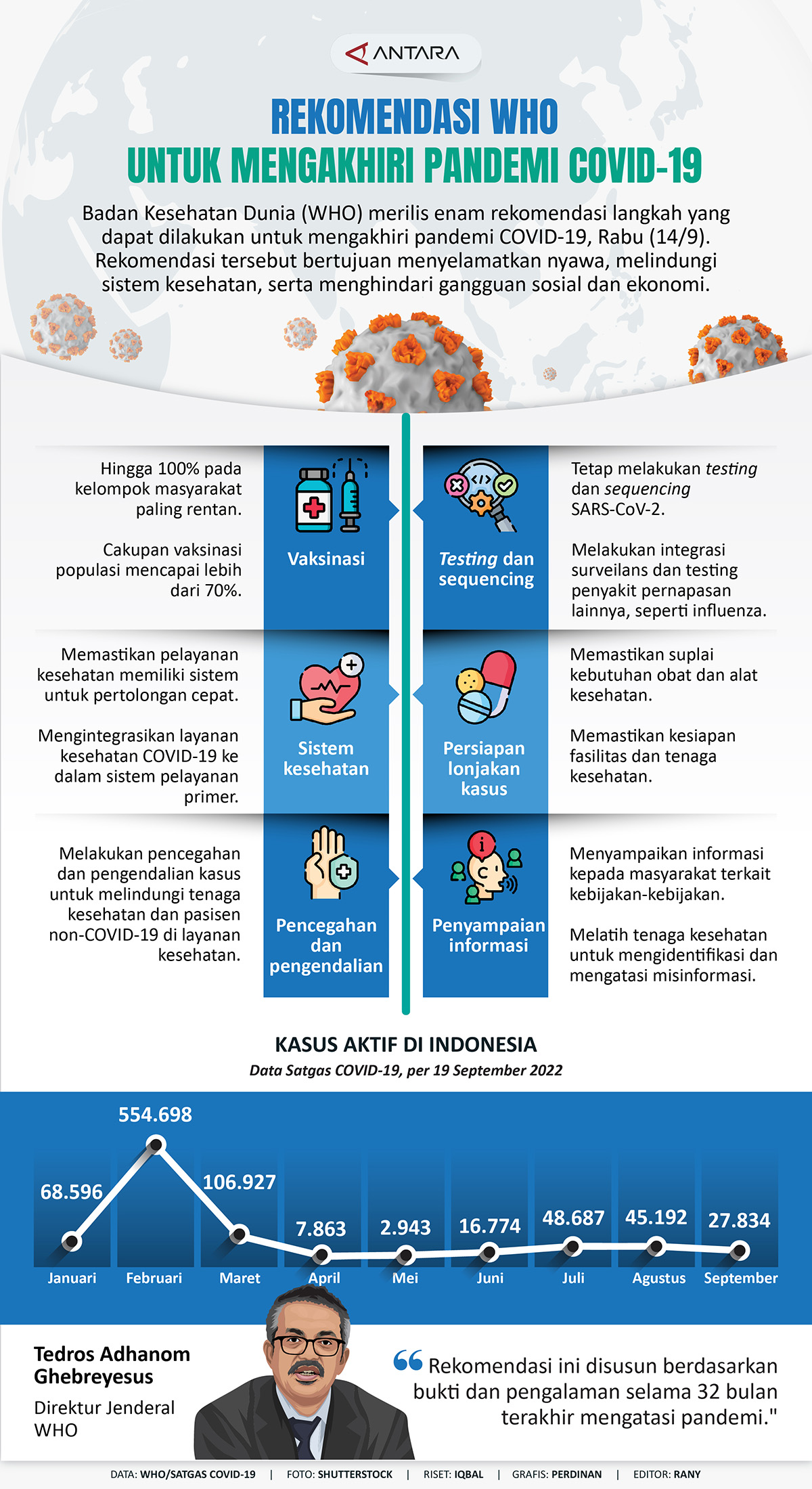 Badan Kesehatan Dunia (WHO) merilis enam rekomendasi langkah yang dapat dilakukan untuk mengakhiri pandemi COVID-19, Rabu (14/9). Rekomendasi tersebut bertujuan menyelamatkan nyawa, melindungi sistem kesehatan, serta menghindari gangguan sosial dan ekonomi.