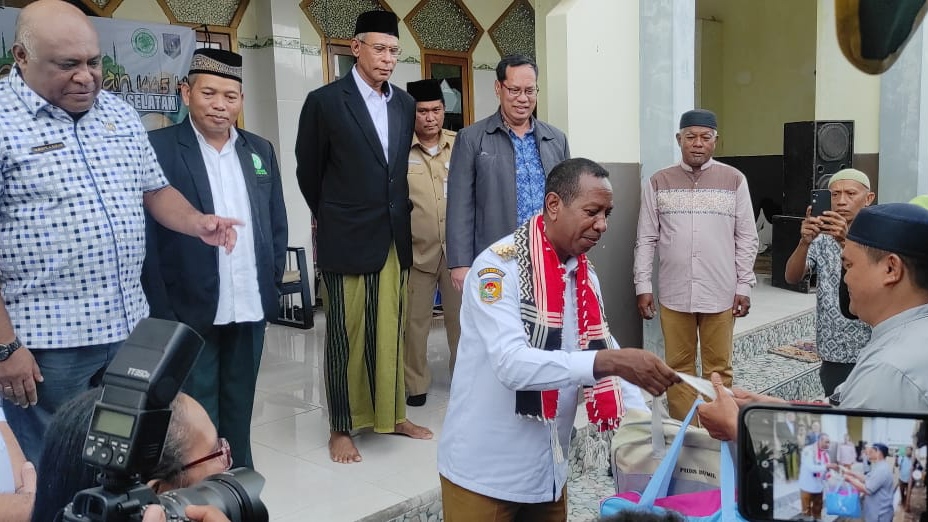 Pj Gubernur Apolo Safanpo juga menyerahkan bantuan Rp100 juta untuk mendukung kemajuan Masjid Al-Amin, Distrik Semangga. (Nuryani)