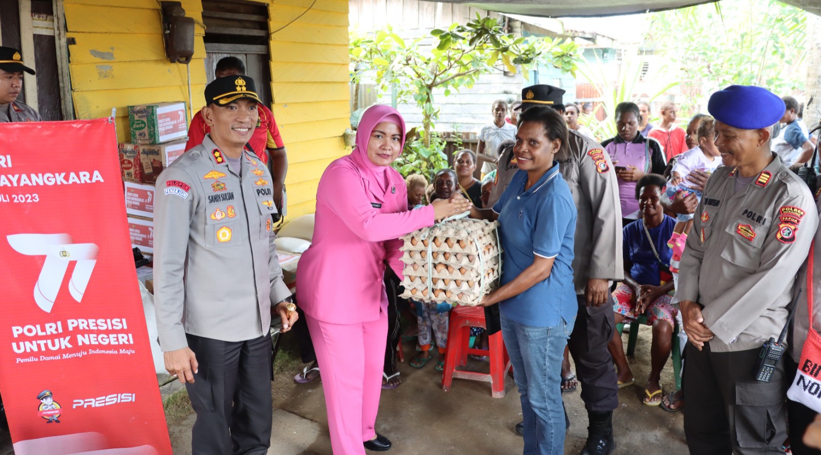 Kapolres Merauke AKBP Sandi Sultan didampingi Ketua Bhayangkari, Para Pejabat Utama Polres Merauke dan anggota serta Bhayangkari Cabang Merauke melaksanakan bhakti sosial ke komplek masyarakat di belakang Jalan Transito, Kelurahan Maro Merauke, Papua Selatan, Jumat (23/6/2023).