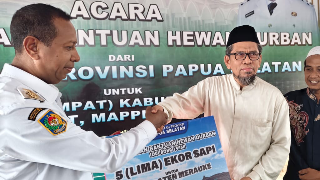 Tak tanggung-tanggung, selain menyerahkan bantuan 5 ekor sapi untuk setiap kabupaten di Papua Selatan, Gubernur Apolo juga membantu sapi kurban untuk Forkompinda maupun lembaga keagamaan lainnya.