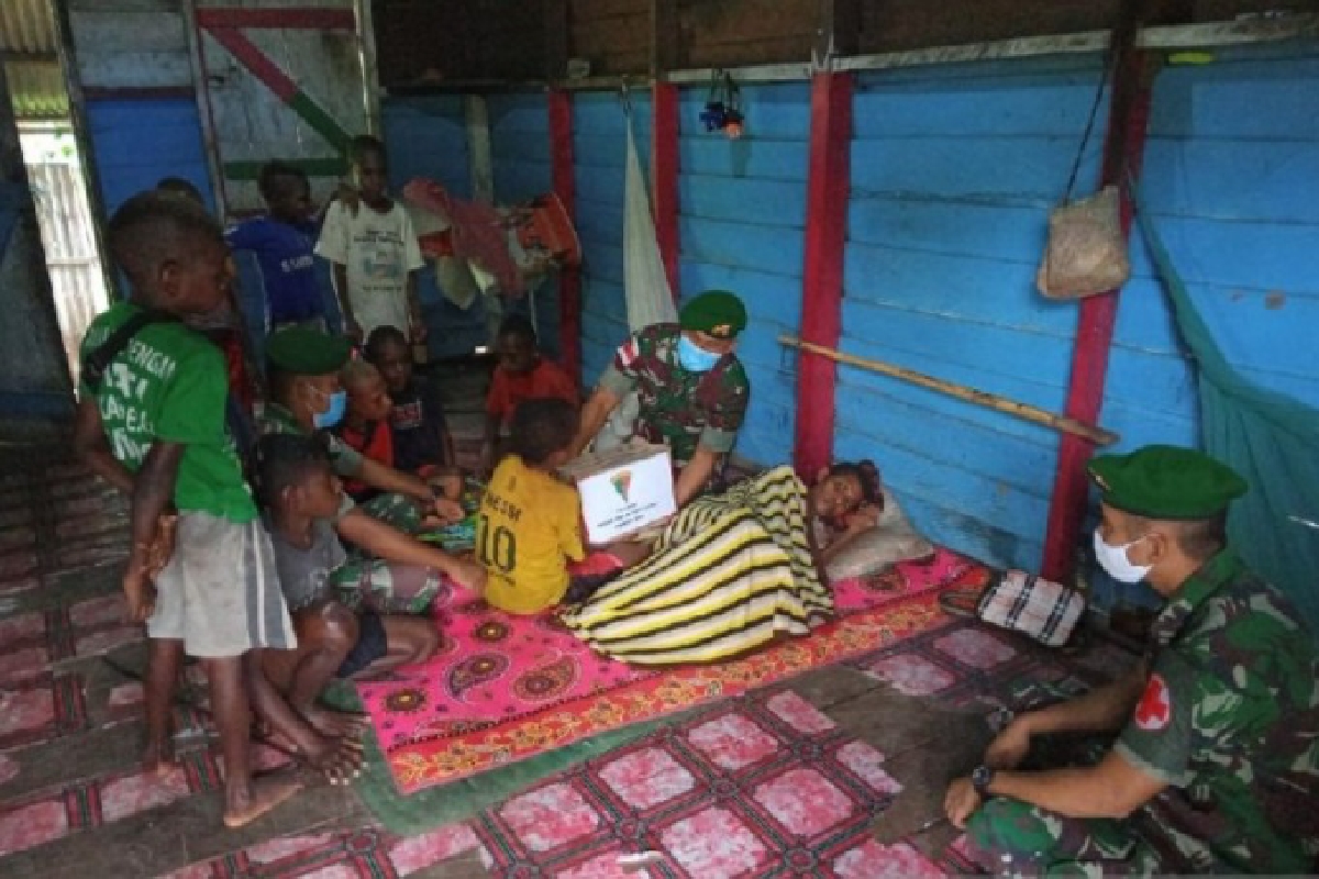 Metro Merauke – Prajurit TNI Satgas Pamtas RI-PNG Yonif 123/RW Pos Rawabiru melakukan pemeriksaan kesehatan kepada warga perbatasan, Margareth, penderita sakit lumpuh, di Kampung Rawabiru Kabupaten Merauke, Papua.