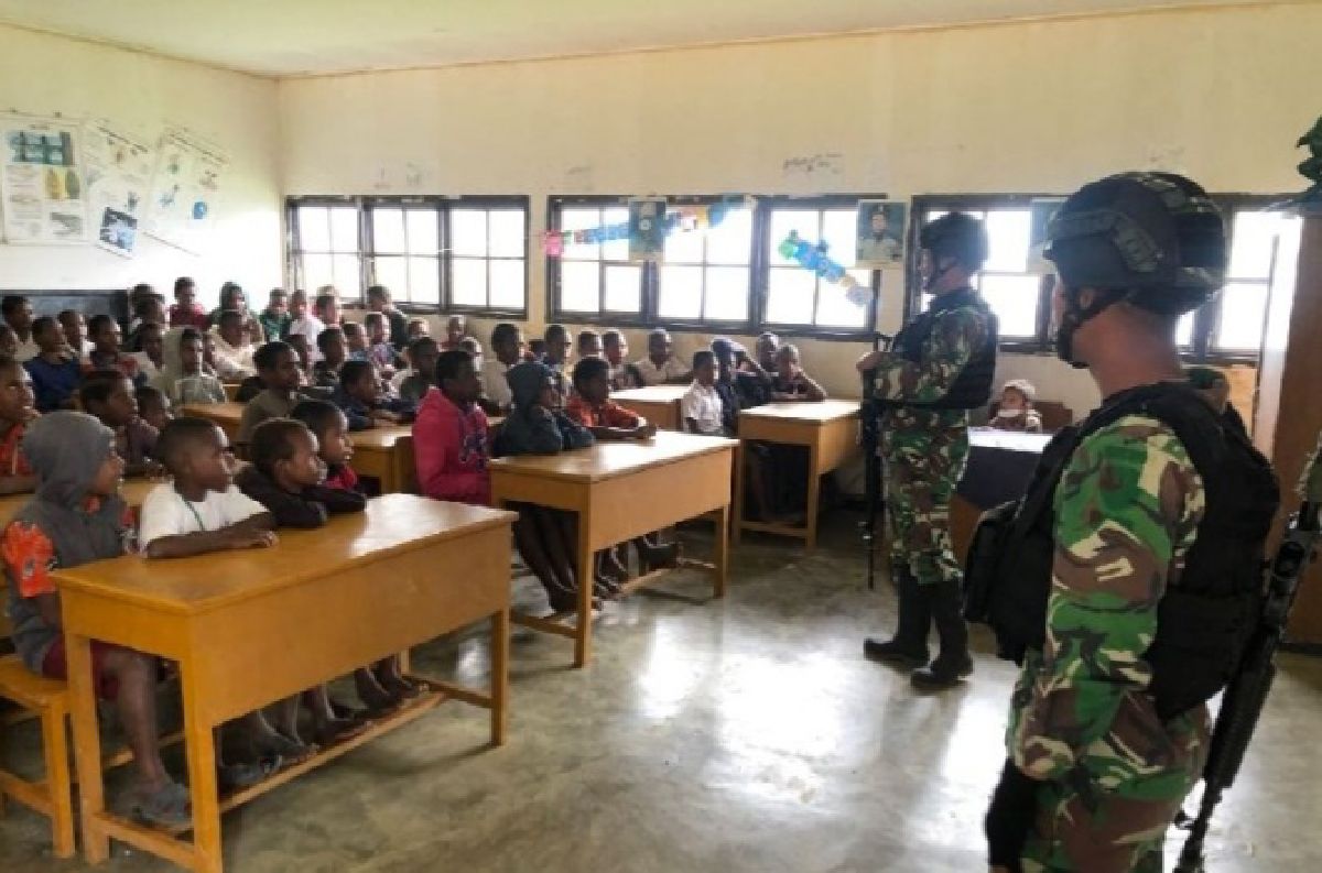 Metro Merauke – Prajurit TNI Satgas Yonif Raider Khusus 114/Satri Musara dipimpin Dantim 1 Lettu Adi melaksanakan kegiatan belajar mengajar siswa SD YPGI Distrik Napua Wamena Kabupaten Jayawijaya Papua.