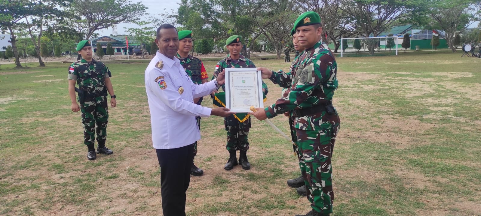 Diakhir acara Danrem 174/ATW memberikan cinderamata, piagam penghargaan dan tanda kehormatan negata Satya Lencana Wira Dharma. (Nuryani)