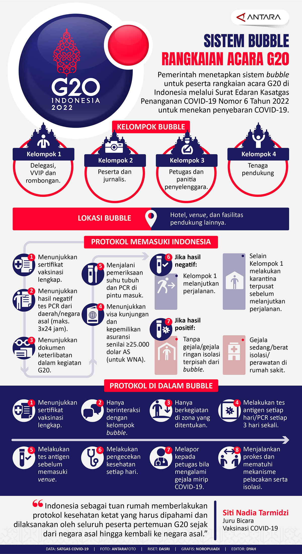 Sistem Bubble Rangkaian Acara G20 Redaksi Metro5 Maret 20225 Maret 2022 Metro Merauke – Pemerintah menetapkan sistem bubble untuk peserta rangkaian acara G20 di Indonesia melalui Surat Edaran Kasatgas Penanganan COVID-19 Nomor 6 Tahun 2022 untuk menekan penyebaran COVID-19. (Antara) Pos terkaitSelamat Hari Kebangkitan Nasional 20 Mei 2023Selamat Memperingati Hari BuruhSelamat Hari Raya Idul Fitri 2023/1444 HSelamat Hari Raya Idul Fitri Mohon Maaf Lahir dan Batin 2023/1444 HSelamat Merayakan Hari Raya Paskah 2023Selamat Merayakan Hari Raya Paskah 2023SELAMAT HARI RAYA NYEPI 2023 TAHUN BARU SAKAIsra Mikraj Nabi Muhammad SAWHari Pers Nasional 2023Hari gizi dan makanan 2023SELAMAT TAHUN BARU IMLEK 2023Hari Guru Nasional dan HUT PGRI ke-77Selamat dan Sukses atas Pelantikan Dr. Ir. Apolo Safanpo, S.T., M.T Sebagai Penjabat Gubernur Papua SelatanSelamat Atas Pelantikan Pj. Gubernur Papua SelatanHari Pahlawan 10 November 2022Hari Sumpah Pemuda 2022Sidang Sinode Ke X & Mupel Ke V ( GPI ) di Papua 2022HUT Ikatan Dokter Indonesia ( IDI ) 2022HUT GKI Di Tanah Papua 2022Hari Santri Nasional 2022Dirgahayu TNI yang ke-77 TahunHari Kelautan Nasional 2022Hari Anak Nasional 2022Hari Pramuka 2022Hari Raya Idul Adha 1443H/2022Dirgahayu Indonesia ke-77 2022Hari Veteran Nasional 2022Tahun Baru Islam 2022Hari Radio Republik Indonesia 2022Hari Bakti Pos & Telekomoniksi 2022
