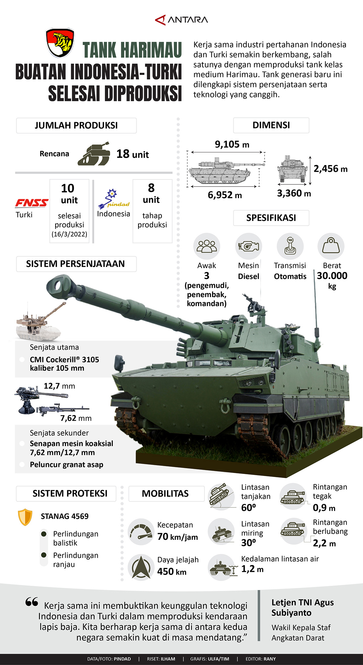 Metro Merauke – Kerja sama industri pertahanan Indonesia dan Turki semakin berkembang, salah satunya dengan memproduksi tank kelas medium Harimau. Tank generasi baru ini dilengkapi sistem persenjataan serta teknologi yang canggih. (Antara)