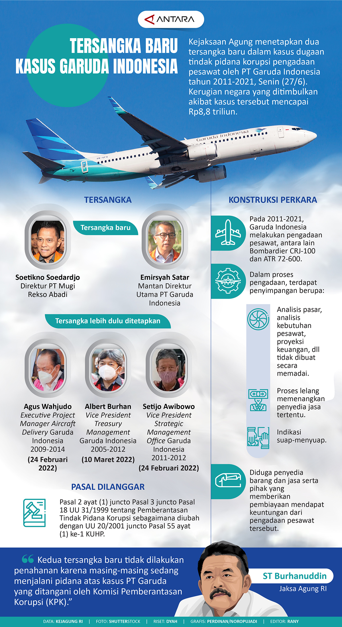 Metro Merauke – Kejaksaan Agung menetapkan dua tersangka baru dalam kasus dugaan tindak pidana korupsi pengadaan pesawat oleh PT Garuda Indonesia tahun 2011-2021, Senin (27/6). Kerugian negara yang ditimbulkan akibat kasus tersebut mencapai Rp8,8 triliun. (Antara)