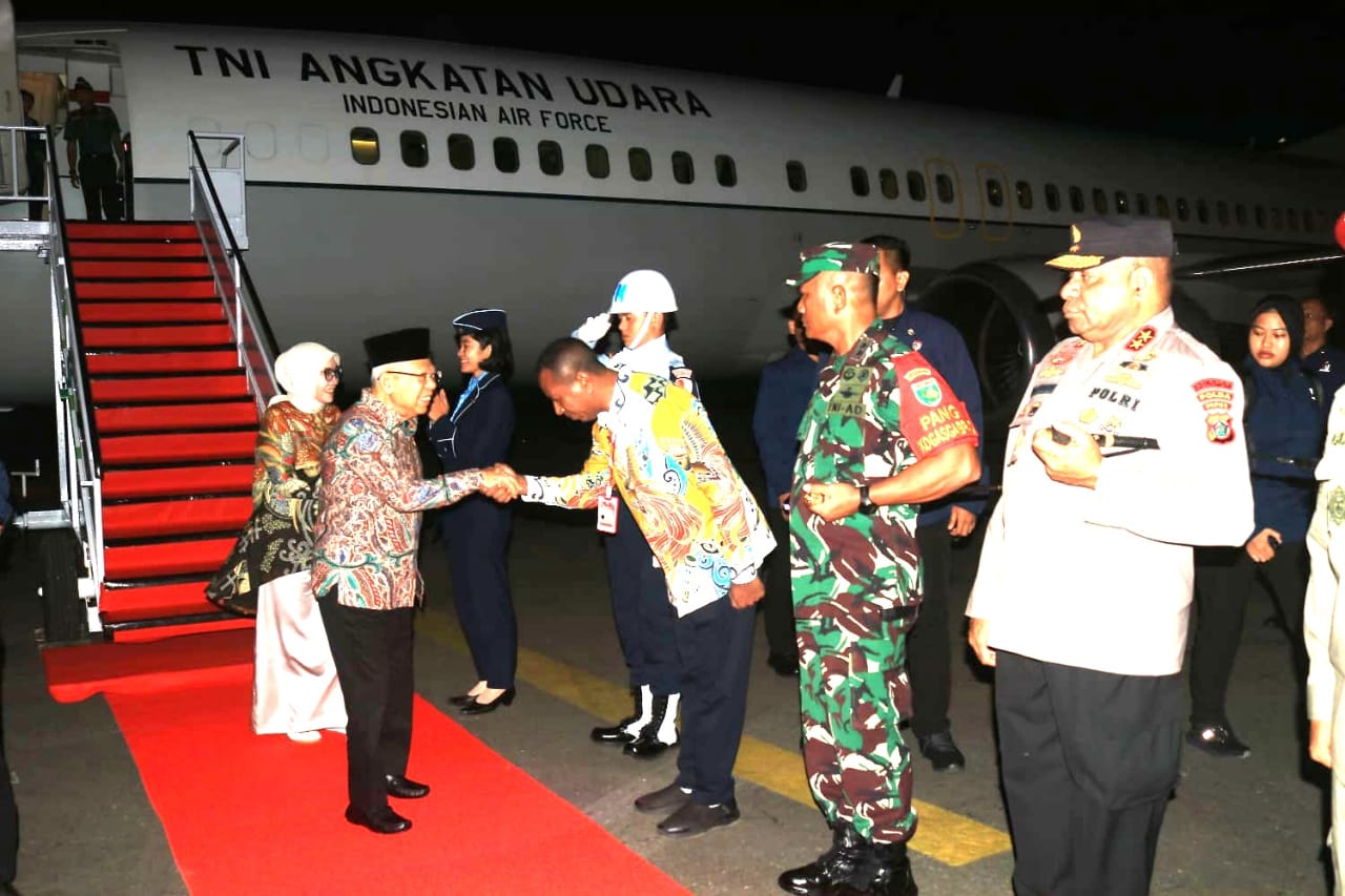 Kedatangan Wapres yang didampingi istri disambut PJ Gubernur Papua Selatan, Apolo Safanpo dan forkopimda di Bandar Udara Mopah, Merauke.