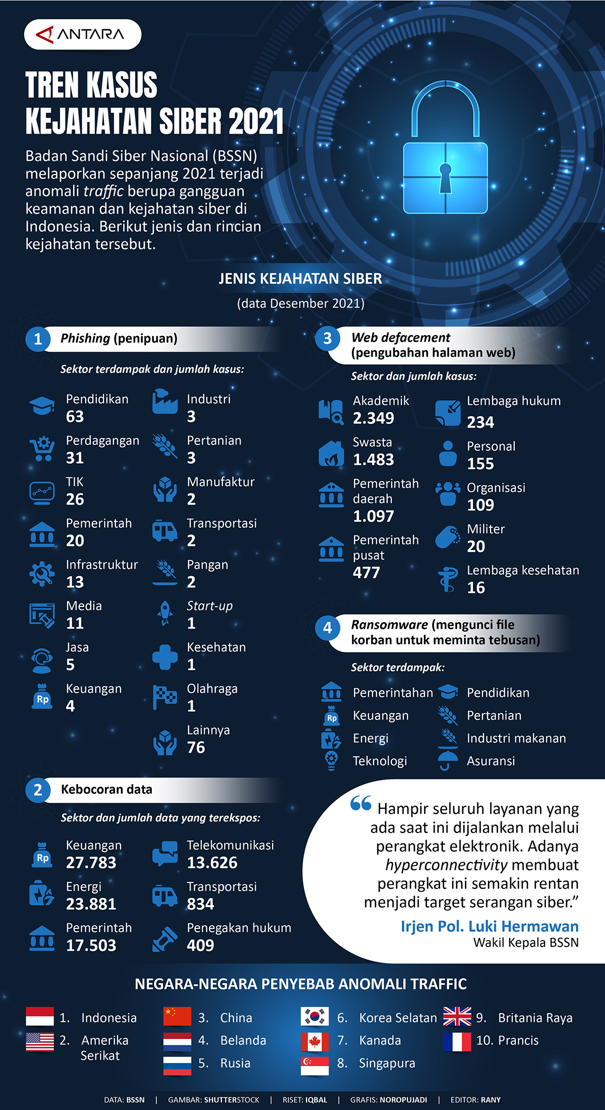 Tren Kasus Kejahatan Siber 2021 Redaksi Metro9 April 20229 April 2022 Metro Merauke – Badan Sandi Siber Nasional (BSSN) melaporkan sepanjang 2021 terjadi anomali traffic berupa gangguan keamanan dan kejahatan siber di Indonesia. Berikut jenis dan rincian kejahatan tersebut. (Antara) Pos terkaitSelamat Hari Kebangkitan Nasional 20 Mei 2023Selamat Memperingati Hari BuruhSelamat Hari Raya Idul Fitri 2023/1444 HSelamat Hari Raya Idul Fitri Mohon Maaf Lahir dan Batin 2023/1444 HSelamat Merayakan Hari Raya Paskah 2023Selamat Merayakan Hari Raya Paskah 2023SELAMAT HARI RAYA NYEPI 2023 TAHUN BARU SAKAIsra Mikraj Nabi Muhammad SAWHari Pers Nasional 2023Hari gizi dan makanan 2023SELAMAT TAHUN BARU IMLEK 2023Hari Guru Nasional dan HUT PGRI ke-77Selamat dan Sukses atas Pelantikan Dr. Ir. Apolo Safanpo, S.T., M.T Sebagai Penjabat Gubernur Papua SelatanSelamat Atas Pelantikan Pj. Gubernur Papua SelatanHari Pahlawan 10 November 2022Hari Sumpah Pemuda 2022Sidang Sinode Ke X & Mupel Ke V ( GPI ) di Papua 2022HUT Ikatan Dokter Indonesia ( IDI ) 2022HUT GKI Di Tanah Papua 2022Hari Santri Nasional 2022Dirgahayu TNI yang ke-77 TahunHari Kelautan Nasional 2022Hari Anak Nasional 2022Hari Pramuka 2022Hari Raya Idul Adha 1443H/2022Dirgahayu Indonesia ke-77 2022Hari Veteran Nasional 2022Tahun Baru Islam 2022Hari Radio Republik Indonesia 2022Hari Bakti Pos & Telekomoniksi 2022