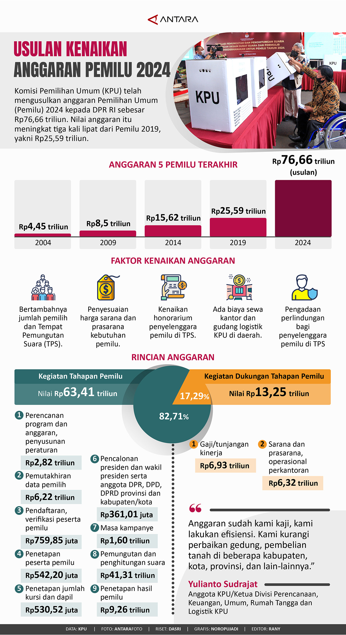 Metro Merauke – Komisi Pemilihan Umum (KPU) telah mengusulkan anggaran Pemilihan Umum (Pemilu) 2024 kepada DPR RI sebesar Rp76,66 triliun. Nilai anggaran itu meningkat tiga kali lipat dari Pemilu 2019, yakni Rp25,59 triliun. (Antara)